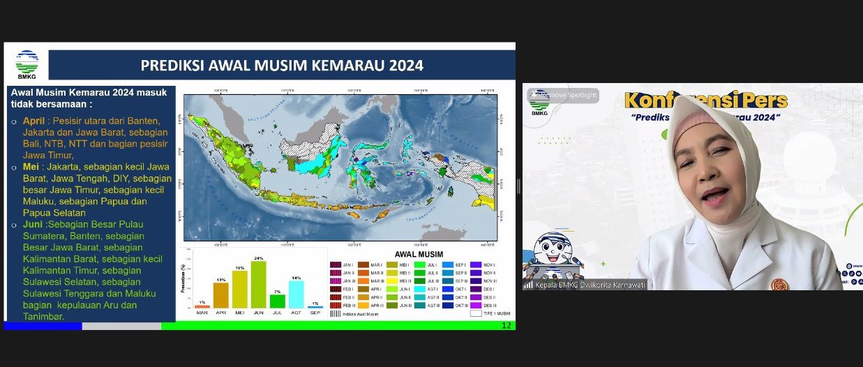 Terkait El Nino, Dwikorita menerangkan bahwa hingga awal Maret 2024, pemantauan terhadap anomali iklim global di Samudra Pasifik menunjukkan El Nino moderat masih berlangsung dengan nilai indeks 1,59. Sedangkan di Samudra Hindia, pemantauan suhu muka laut menunjukkan kondisi IOD Netral. Fenomena El Nino tersebut, kata dia, diprediksi akan segera menuju netral pada periode Mei-Juni-Juli 2024 dan setelah triwulan ketiga (Juli-Agustus-September) 2024 berpotensi beralih menjadi La Nina-Lemah. Sementara itu, kondisi Indian Ocean Dipole (IOD) diprediksi akan tetap netral setidaknya hingga September 2024. Sedangkan kondisi suhu muka laut di Indonesia, diprediksikan berada dalam kondisi yang lebih hangat, dengan kisaran +0.5 – +2.0 derajat celcius lebih hangat dari kondisi normalnya.