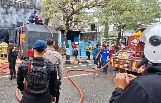 Mereka berupaya memadamkan api dengan menggunakan mobil water cannon dan dibantu mobil pemadam kebakaran.
