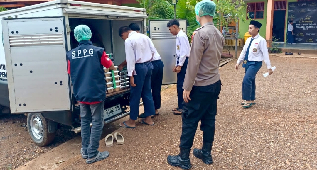 Kepala SPPG Muara Wahau, Pedro Gonzalez Yosep Lewo Karoko bersama tim lapangan memastikan penyaluran berjalan sesuai prosedur. Aparat kepolisian dari Polsek Muara Wahau turut hadir untuk memastikan kegiatan berlangsung aman dan tertib.