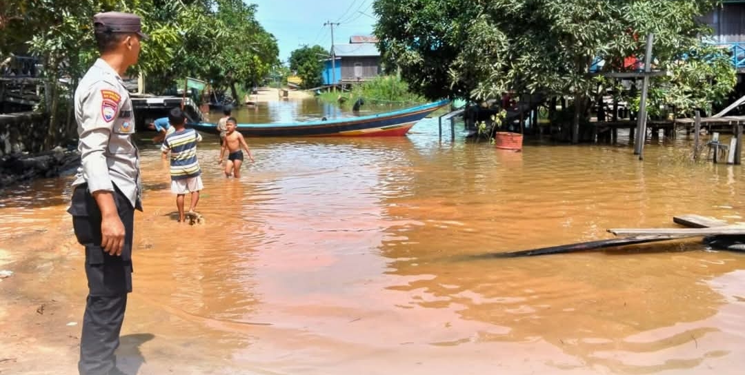 TENGGARONG, KASAKKUSUK.com – Petugas kepolisian dari Polsek Kota Bangun, Polres Kutai Kartanegara memantau kondisi banjir di Desa Liang, Kecamatan Kota Bangun, Kabupaten Kutai Kartanegara pada Selasa, 13 Januari 2026.