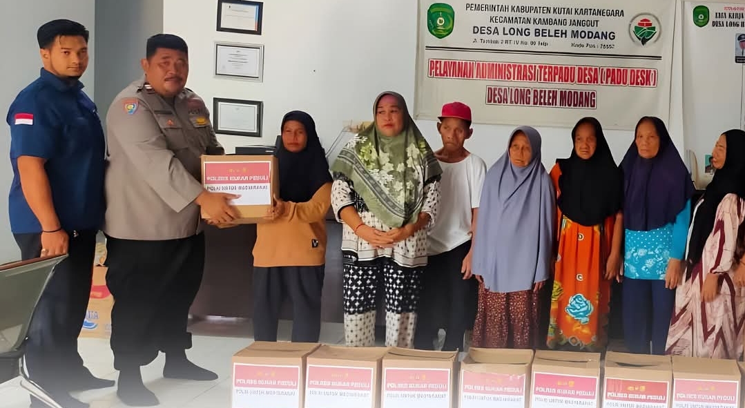 Bantuan diserahkan personel Polsek Kembang Janggut yakni Kanit Binmas dan Ps. Kanit Propam, dengan didampingi Kepala Desa Long Beleh Modang.